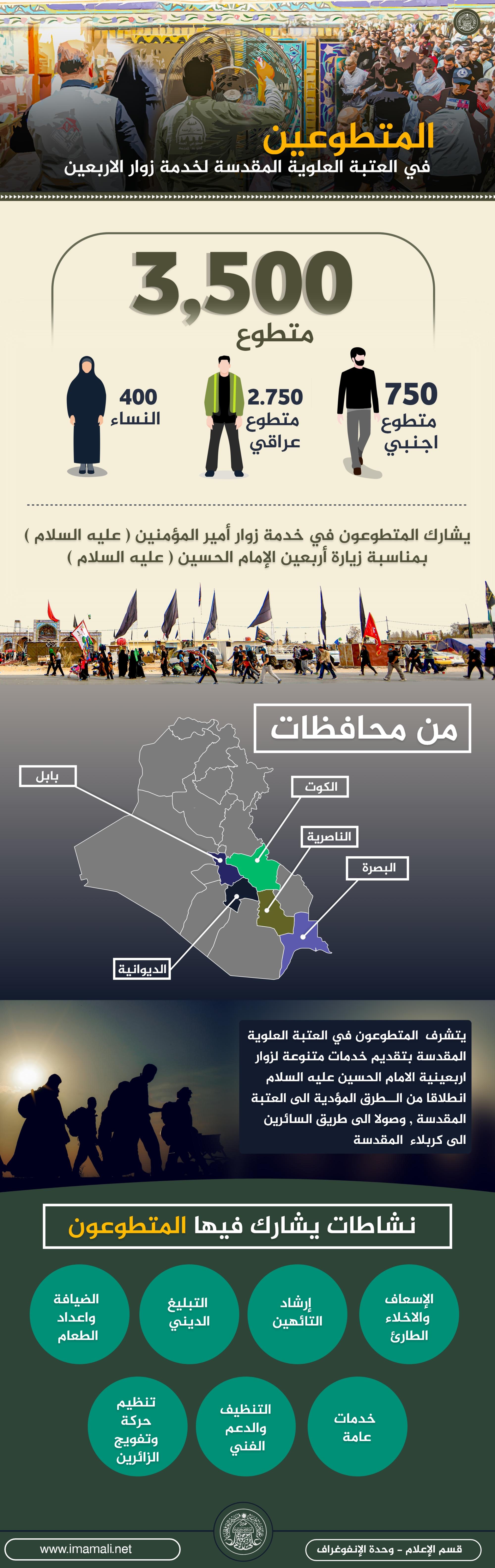 يتشرف المتطوعون في العتبة العلوية المقدسة بتقديم خدمات متنوعة لزوار اربعينية الامام الحسين عليه السلام انطلاقا من الــطرق المؤدية الى العتبة المقدسة , وصولا الى طريق السائرين الى كربلاء المقدسة
